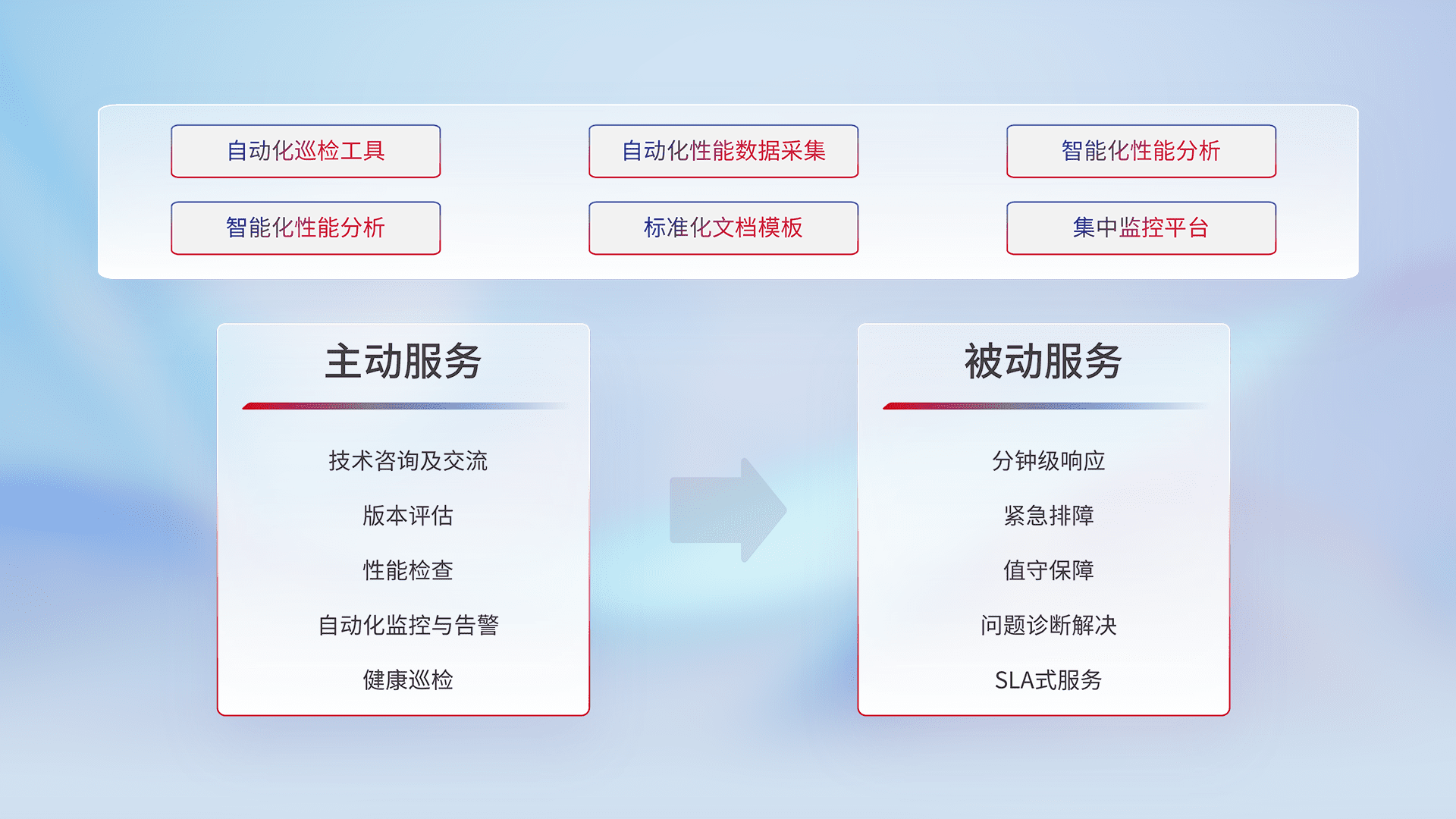 智能化工具和标准化文档,,保障服务质量,,,,提供主动服务(包含技术咨询、、、版本评估、、、性能检查、、、、自动化监控与告警、、健康巡检)和被动服务包含(分钟级响应、、、、紧急排障、、值守保障、、、问题诊断解决、、、SLA服务)。。